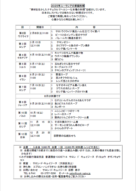 2025年料理教室「ユーラシアの家庭料理」スケジュール
