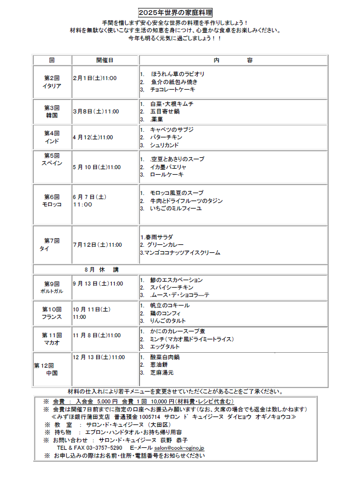 2025年料理教室「世界の家庭料理」スケジュール